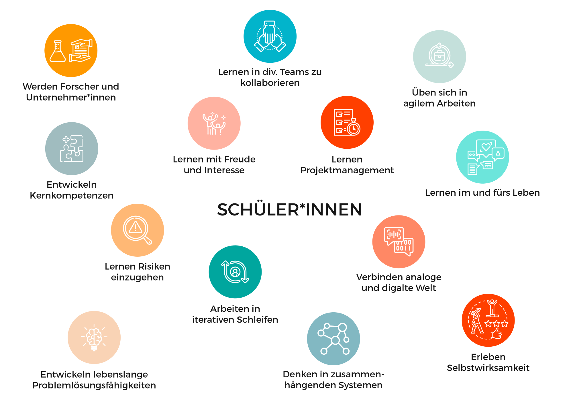 Jedes Projekt verbindet bewusst und zielgerichtet das Fachwissen mit X-Schule Kernkompetenzen des 21. Jahrhunderts. Kommunikation, Kollaboration, Selbstführung, Strategisches Denken, Unternehmertum und Führungsqualität liegen sowieso in der Natur dieses Arbeitens, da die Schüler*innen ihre Projekte managen, verhandeln, Aufgaben verteilen und Wege finden müssen, mit diversen Gruppen zu kollaborieren. Sie entwickeln ihre Vision, stellen Pläne auf, initiieren Unternehmungen, lernen, in funktionalen Beziehungen zueinander zu stehen, mit Niederlagen umzugehen und aus Fehlern zu lernen. Die Schülerinnen und Schüler werden sich bewusst, dass sie in der Lage sind, herauszufinden, was sie wissen müssen, und diese neuen Informationen zu nutzen, um Lösungen für Situationen zu finden, auf die es keine offensichtliche Antwort gibt. Sie gewinnen mehr Selbstvertrauen und beteiligen sich bald auch außerhalb des Klassenzimmers an diesem Prozess. Sie werden zu lebenslangen Problemlösern. Dabei verbinden sie analoge und digitale Werkzeuge, um Produkte von echtem gesellschaftlichen Mehrwert zu kreieren. Sie erleben Selbstwirksamkeit und fühlen, dass sie die Welt mitgestalten können. Dies beugt das Gefühl von Ohnmacht, das viele Jugendliche in soziale Apathie, Nihilismus oder Fanatismus führen kann.