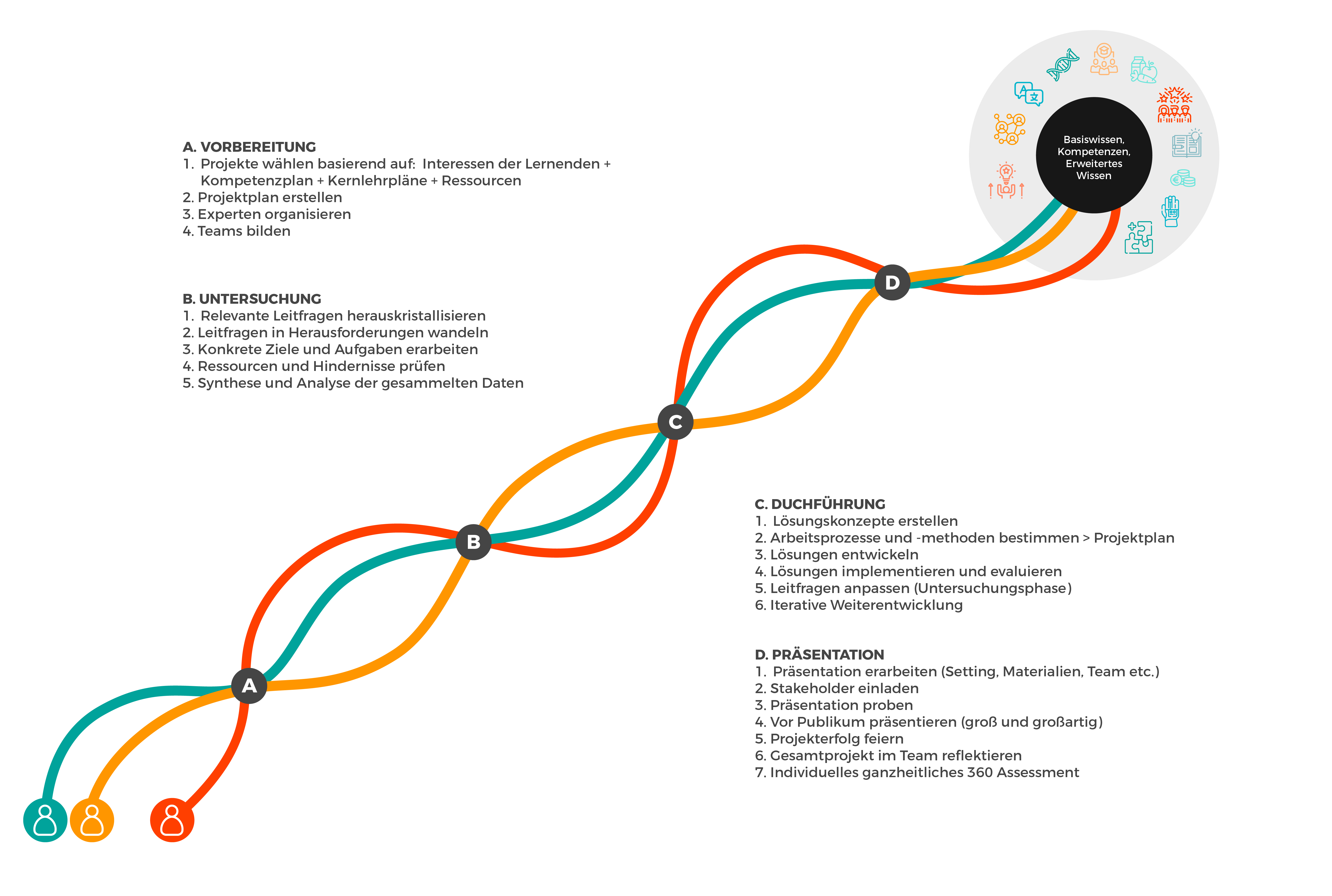 Können wir den Nachrichten trauen? Wie gehen wir am besten mit Geld um? Wie können wir den Obdachlosen im Viertel helfen? Die Projekte beginnen mit einer Fragestellung, einem Thema oder einem Phänomen, das die Lerngemeinschaft interessiert. Zunächst gehen die Schülerinnen von dem abstrakten großen Thema zu konkreten Leitfragen über und entwickeln Konzepte, um die sich daraus ergebenden Herausforderungen zu lösen. Es gilt die vorhandenen Ressourcen, sowie Hindernisse zu prüfen, Arbeitsprozesse und - methoden zu bestimmen, Lösungen im Team zu erarbeiten, zu implementieren und zu evaluieren. Dabei stoßen die Schülerinnen an ihre Grenzen. Um voran zu kömmen, müssen sie sich fachliches Wissen und Fähigkeiten aneignen. So entstehen aus authentischen Lernbedürfnissen innerhalb eines Projektes fachgebundene Sprints. Diese werden organisiert durch Inputs, selbstorganisiertes Lernen und Tutorien.