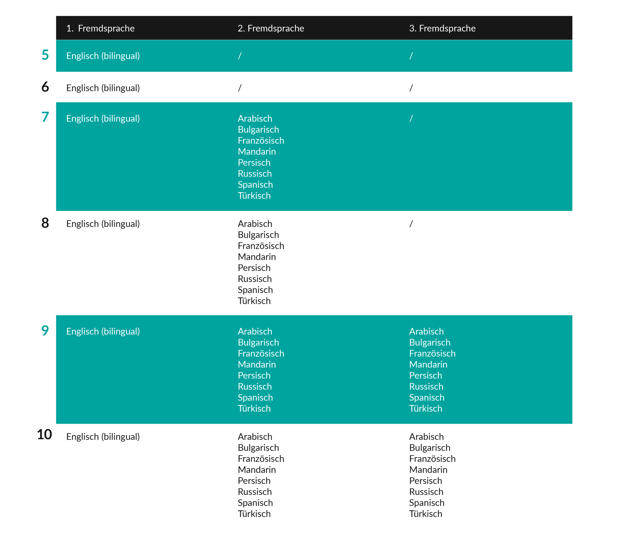 An der X-Schule verstehen wir diese Dynamik und wollen ganz bewusst nicht dagegen arbeiten, sondern dem Lernbedürfnis der Kinder entsprechen. Wir wissen, dass erstsprachliche Förderung (Mutter- und/oder Vatersprache) die Grundlage ist für jede weitere Sprachentwicklung und das Erlernen weiterer Sprachen. Wir bieten daher muttersprachliche Förderung für die Schüler*innen innerhalb der Schule anbieten und zusätzlich für die größeren Gruppen von Schüler*innen diese auch vertieft als weitere Sprachen anbieten. Neben Französisch oder Spanisch können so auch Türkisch, Arabisch, Persisch, Russisch oder Bulgarisch und Mandarin gewählt werden. Auf der Grundlage der Lernbedürfnisse der Schüler*innen können diese dann weitere Fremdsprachen wählen und bis zum Abschluss fortführen. In den gewählten Sprachen können auch Teile der Projekte, der Expo und andere Lernergebnisse erarbeitet werden. Ein Austausch mit anderen Schüler*innen weltweit wird dabei angestrebt, um die Sprachen nicht nur theoretisch zu lernen, sondern auch mit Erstsprachlern in den jeweiligen Ländern zu üben.
